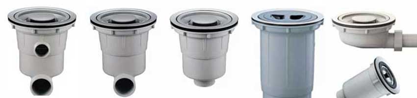 キッチン排水 部品 トラップは排水口の口径により主に呼び径「180Φ」と「115Φ」の2種類が主に使われています。本体部分の深さに「深型」「浅型」「薄型」の3種類があり、シンクの数により1槽用、2槽用とオーバーフロー付シンク対応があります。最近では引出し式のシンクキャビネットなどでの収納スペースを有効に使うために浅型や薄型が多く使われています。