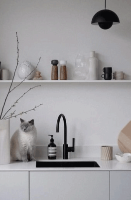 シンク周りがスッキリし、水栓や扉のハンドルなどの色や質感がワンポイントとして引き立つ