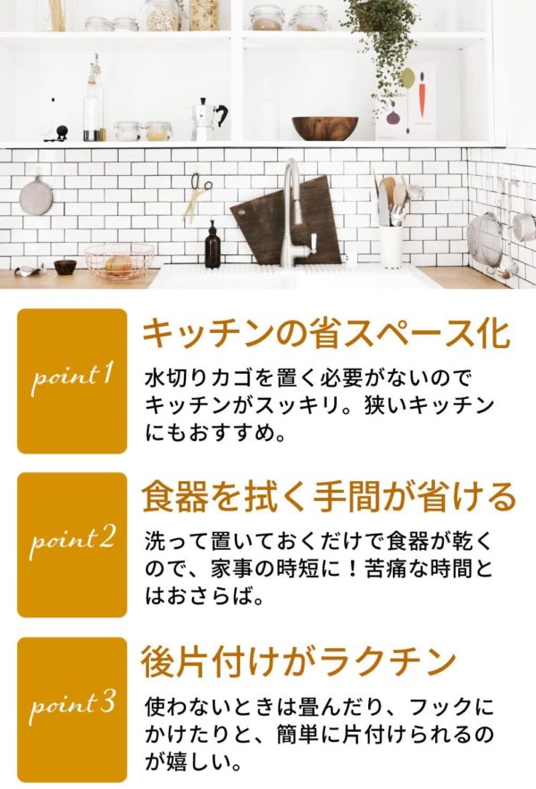 • 【スペースを有効に】キッチンのスペースを有効に使いたい!置き型のラックを使用せずに水切りマット(ドライングマット)を使用して、キッチンを広々活用!必要な時に出し、使用しないときは片付けられるのでとっても便利♪
